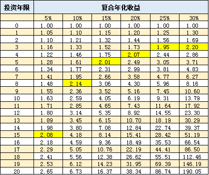投资相同的金额,如果想要达到翻倍的收益,如果年化复合收益率为5%,需要15年,如果年化复合收益率10%,则需要8年,如果年化复合收益率达30%,则需要3年的时间。