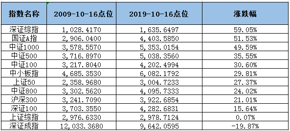 但从2009年10月16日至2019年10月16日重要指数来看,除深证成指下跌19.87%之外,其余指数都是有出息的,其中甚至还有出息超50%的指数。所以说A股十年不涨细看之下,确有失公允,上证综指受到受石油、船舶等板块周期性走弱影响,十年仍在回升中。但却不乏表现较为不错的指数。