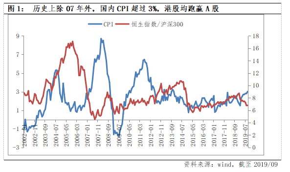 9月CPI“破3%”,而猪肉价格仍在上升,市场对于通胀压力的担忧在加剧,这也是近期A股表现较为低迷因素之一。而广发证券发展研究中心发现一个有趣的现象,除了2007年,国内CPI超过3%期间,港股均跑赢A股。统计规律背后的核心逻辑在于通胀对于国内货币政策宽松的掣肘,而港股所受影响较小。近日美联储如期降息25BP,香港金管局随后跟降,而市场对于国内央行降息的预期并未显著提升。虽是结构性通胀,但A股估值扩张受到显著影响。