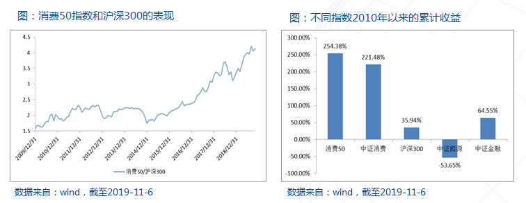 我们用消费50指数除以沪深300指数,通过观察比值序列来看一下市场的变化特征,看消费50指数能不能抓住市场的一些机会?可以看到,2016年之后,消费50指数大幅跑赢沪深300指数,这一个阶段对应的正是北向资金的开通,外资的大规模流入。