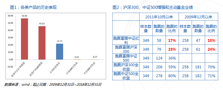 我们经常会讨论A股市场的效率问题,A股市场是可以获得alpha的。我们做了一个统计,2010年到2018年,沪深300全收益、中证500全收益指数的收益率几乎为0,而市场里面跑赢沪深300全收益指数的主动基金的比例大约是59%,也就是说全市场主动基金的平均回报率是可以跑赢指数的,平均超额收益为21.73%。