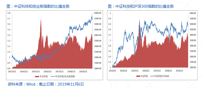 我们用科技50指数除以创业板指,可以发现科技50指数稳定的跑赢创业板指。对比沪深300指数,2015年以来,科技50指数的走势和沪深300指数差不多。但考虑到2015年之后市场向白马股高度集中,中小市值板块估值下杀的非常厉害,在这样的情况下,科技50指数表现依然不输沪深300指数,表现比较稳健。