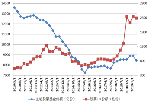 目前国内的量化和指数化投资处于一个大发展的时代,我们将ETF和主动权益型基金做一个对比,可以发现,过去10年,相比主动股票型基金,股票ETF基金的份额增长呈现明显的差异走势。