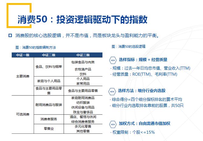 我们今年做了一个消费的指数,中证消费50。在编制指数之前,我们也把中证指数公司编的中证消费指数权重股和外资的消费持股做了对比。可以发现,外资的持股非常集中,超配非常明显。茅台占比高达46.54%,在全部消费股中的市值占比接近一半。但与此同时,茅台的ROE也是这些消费股中最高的。除了茅台,五粮液、伊利、海天味业也都配置了一些,这些公司的ROE也都非常高。但并不是所有的消费股都具有赚钱效应,例如新希望、永辉超市,的ROE并不特别高,只有7%左右,所以外资的配置比例非常低。通过数据可以发现,外资在进行配置的时候,并不是按照市值来进行配置,其真正关心的是公司的盈利。这就给我们一个启示,我们在编制指数,或在买消费股的时候,坚持的投资理念应该是什么?因此我管理的消费50ETF,在编制指数的时候,参考了主动基金经理选消费股的思路,用量化的方式实现出来,遵循的是以投资逻辑主导的量化方法。