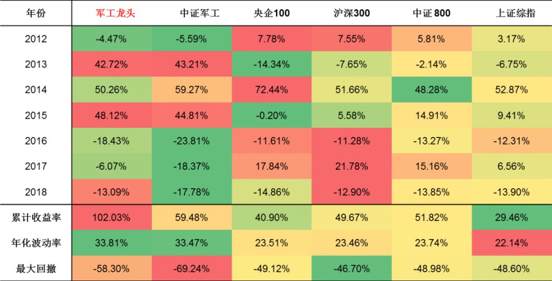 我们用以上思路构建出的军工龙头指数实现了比较好的投资回报率。2012年到2018年,军工龙头指数的累计收益率是102%,中证军工指数的60%,超额收益是很明显的。