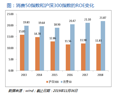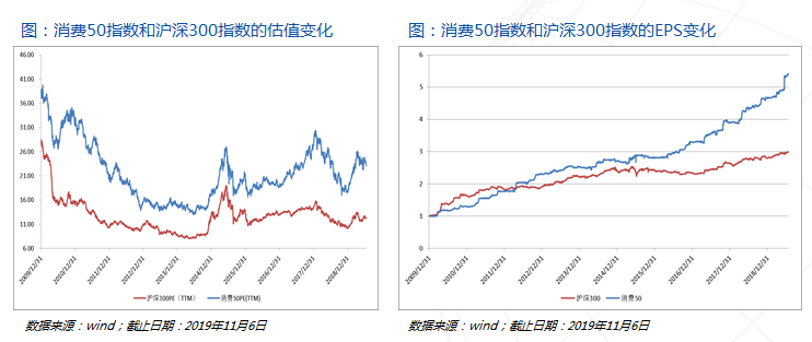 股价=PE×EPS,指数表现可以分为两个部分,一部分是估值,一部分是盈利。2011年以来,消费50指数和沪深300指数都经历了一个杀估值的过程,下杀幅度大约是40%-60%,但两个指数的EPS增速存在很大的差异,消费50指数的EPS增速接近20%,而沪深300指数是12%,EPS增速的差异使得两个指数表现出现分化,一个指数持续创新高,另一个指数持续震荡。