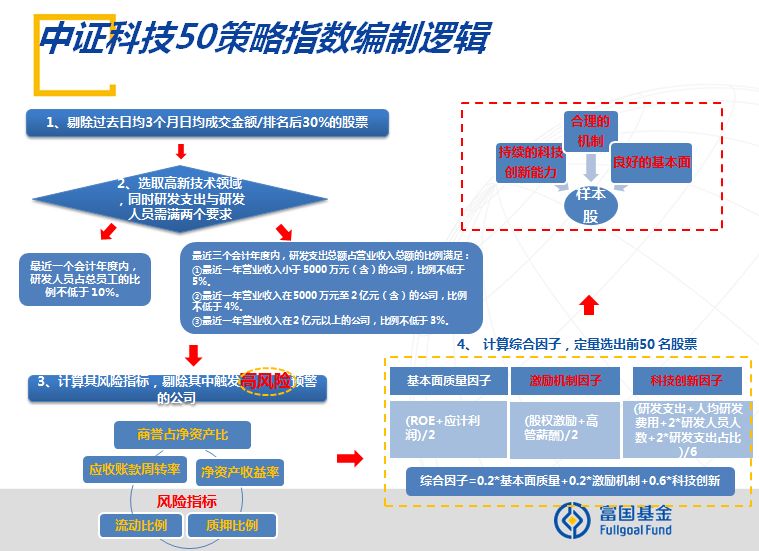 但仅用以上的方法来选股还不够,因为科技行业有很多不老实的公司,喜欢搞高商誉、股权质押,甚至是跑路。这样的公司我们也是要剔除的,所以还要构建一个风险指标,包括商誉、应收账款、流动比率、质押比率、净资产收益率5个指标。当然,不是说公司高商誉或者做一些股权质押就一定有问题,但当5个指标中有3个或4个指标出现问题的时候,这个公司很大可能会有问题。通过这样的方法,我们把一些高风险的公司剔除掉,最终筛选出50只股票构建指数。