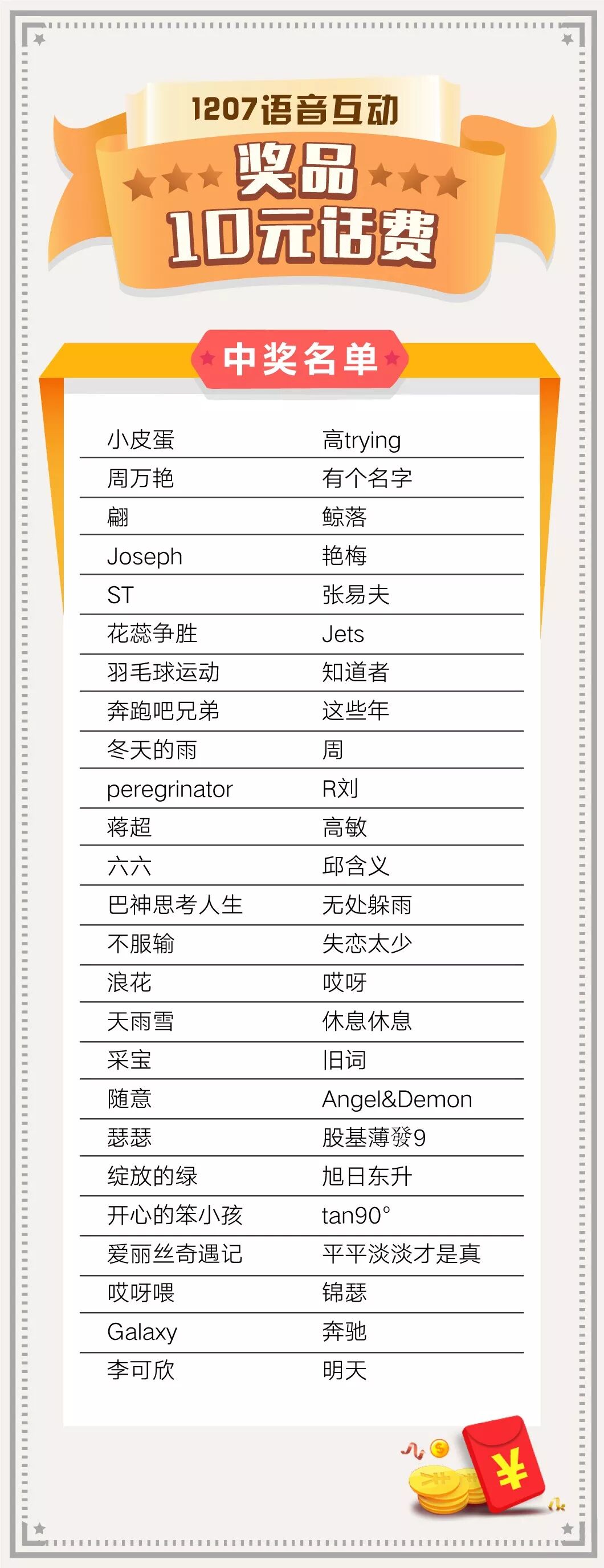 话费将于12月13日(本周五之前)充值到中奖客官后台预留的手机号码中,请各位客官耐心等待~