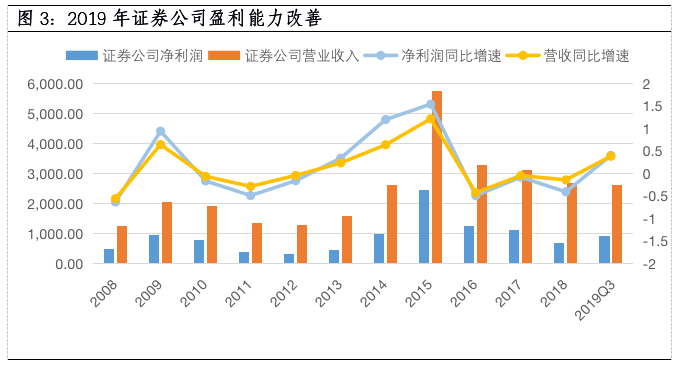 2019年前三季度证券行业营业总收入同比增长37.96%,净利润同比增长39.76%,经营业绩扭转连续三年下滑的不利局面并出现显著改善,行业新一轮上升周期或已开启。展望2020年,资本市场改革有望促进证券公司进一步拓宽业务范围,增加利润来源,从“通道类中介”向“专业型投行”转型。从竞争格局来看,在行业集中度提升的背景下,大型券商凭借规模优势、平台优势、品牌优势,有望进一步提升龙头效应,特色券商则有望通过其特色业务的领先优势脱颖而出。预计未来证券行业将呈现“大而全”、“小而精”券商共存的局面,推荐大型龙头券商和特色券商的投资组合。