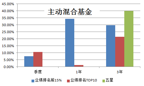 注:在研报具体的实证部分,上海证券引入了前40%业绩击中率的概念。前40%击中率是指被考察基金作为一个整体持有一定期限后业绩表现居于同类前40%的概率。上海证券以五星基金评级前15%的标准,在每个报告期分别取了短、中、长期基金历史业绩排在同类前15%的产品。对他们之后的前40%业绩击中率进行了跟踪比较。