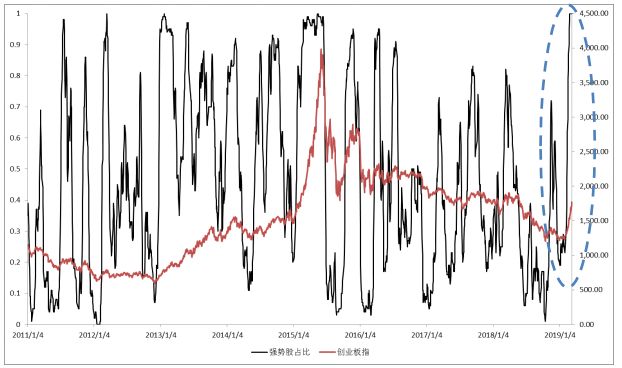 级掌柜看了一下最近创业板指的强势股占比,已经连续N天在100%的高度了,2011年以来,除了2015年大牛市时期,其余时期均无法在这样的高度持续很久。