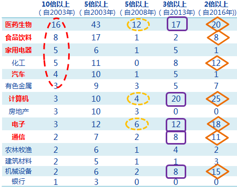 富二家也做过一张经典的图表,统计了近15年A股市场涨幅超过10倍及5倍的个股(分别有66只、197只)。从表格来看,这些长牛股也是主要集中在医药生物、食品饮料、家用电器及TMT行业等大消费行业。