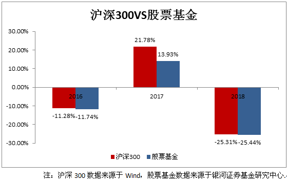 先来看看近3年沪深300指数与全市场股票型基金平均涨跌幅的对比: