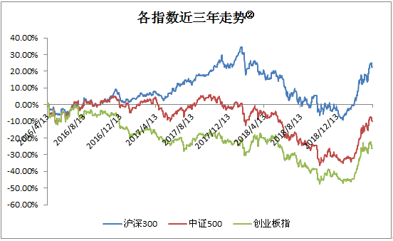 涨幅高:近三年,市场风格总体偏向大盘蓝筹股,沪深300的走势明显好于中证500、创业板指;