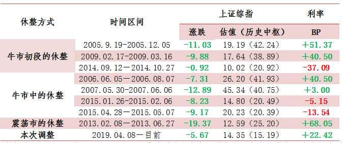 牛市中的调整。估值接近历史中枢甚至超越十年历史中枢,估值修复结束,需要等待更明确的牛市推动信号和大量增量资金。如2006年6月、2007年5月、2015年1月和2015年4月,但后期猛烈的上涨意味着性价比仍不错。