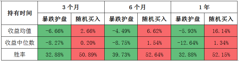 无论是收益均值、中位数、还是胜率,无论持有3个月、半年还是一年,暴跌护盘的业绩都远低于随机买入。这个择时策略是多么的适合做空。