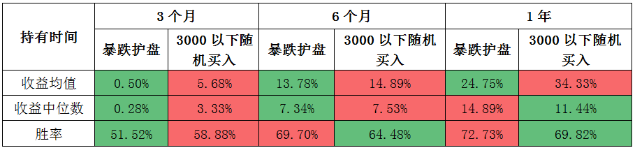 如果持有半年到一年的时间,3000点以下的暴跌护盘在胜率和收益中位数上,更有优势。