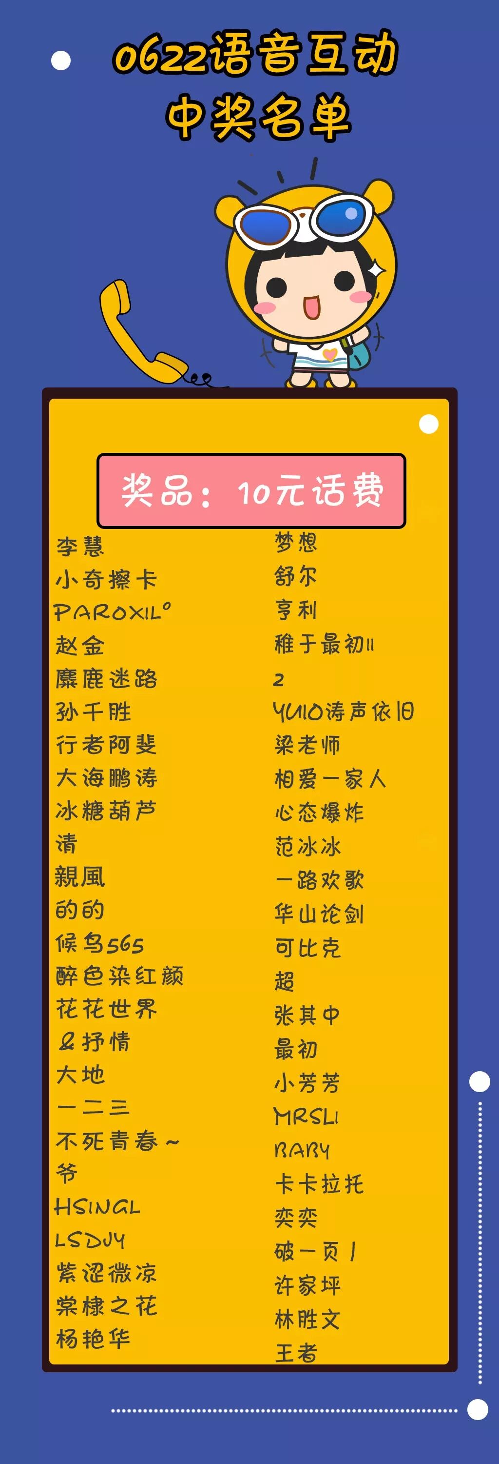 话费将于6月28日(本周五之前)充值到中奖客官后台预留的手机号码中,请各位客官耐心等待~
