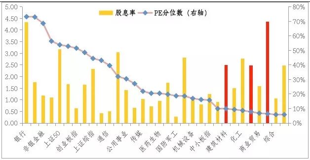 对比28个申万一级行业,房地产、建筑材料、钢铁等估值处于历史低位,分别处在历史PE的7.80%、9.89%和6.43%的底分位水平,且具备较好的股息率。