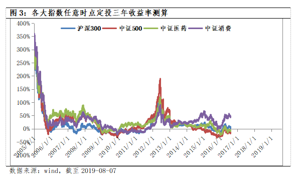 ★最大值出现在定投三年维度,为298.88%,随时间拉长呈倒U型分布;