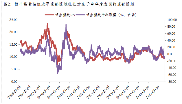 目前恒生指数9.5倍的PE(Price Earnings Ratio,市盈率),不仅显著低于2005年以来的平均估值12.24倍,而且还处于历史底部区间。另据wind数据统计,截至2019-09-05,2005年以来任何时点买入恒生指数的平均半年收益率在4.0%,而目前恒生指数最近半年持有期的回报率已经降至-8.44%,大幅偏离平均水平;此外,从统计特征来看,港股市场每一轮估值水平的底部,往往对应于恒生指数半年持有期回报率的底部水平。