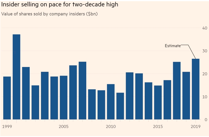 由于担心美国长期牛市即将进入尾声,全美高管正在以20年来最快速度抛售自己公司的股票。