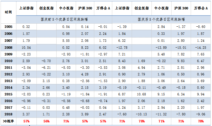 (2)如果节前5个交易日涨幅均为负数的年份(09、11、16年),国庆过后5个交易日涨幅均为正。