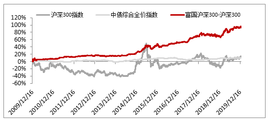 计算说明:“富国沪深300-沪深300”的计算方式为富国沪深300指数增强基金每日相对基期的收益率减去沪深300指数每日相对基期的涨跌幅,基期为2009年12月16日,收益率根据每日份额净值计算。每日份额净值数据来自于富国基金官网(已经托管行复核),指数数据来自于wind,时间区间:2009-12-16至2019-12-31。