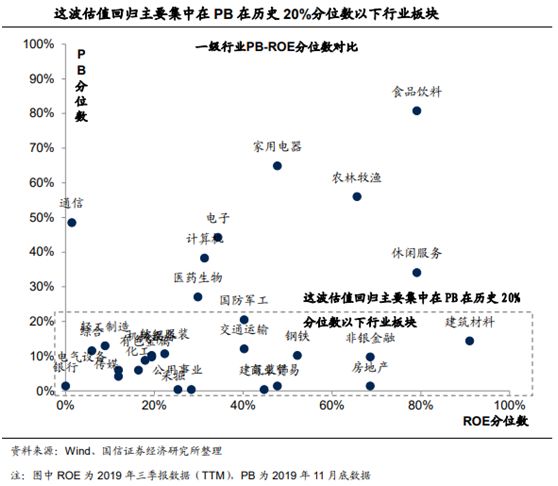 用PB代表估值水平,用ROE代表盈利水平,可将各一级行业做一张散点图。仔细观察可得,11月中旬以来表现较好的板块,基本是PB在历史20%分位以下的水平。