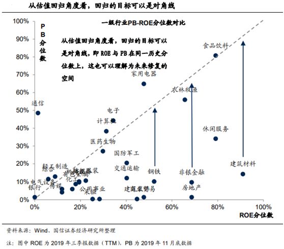 从这个角度看,当前PB-ROE位置离对角线越远的行业板块,回归修复的可能性就越大。