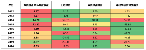 2012-2020年,处于前50%分位所有双债基金年度收益均为正。