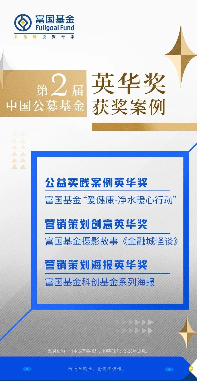 此外,凭借出色的品牌综合实力和在基金营销领域的领先探索,富国基金荣获“电商业务发展基金公司英华奖”;富国基金两项营销案例(摄影故事《金融城怪谈》、科创基金系列海报)荣获“营销策划创意英华奖”和“营销策划海报英华奖”。