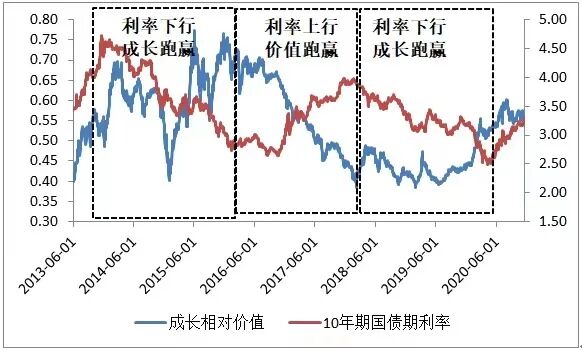 1、利率上行周期,价值风格好像更容易胜出。我们把利率和成长价值相对走势的两条折线放在一起,对比就能发现,它们走势很多时候是相反的: