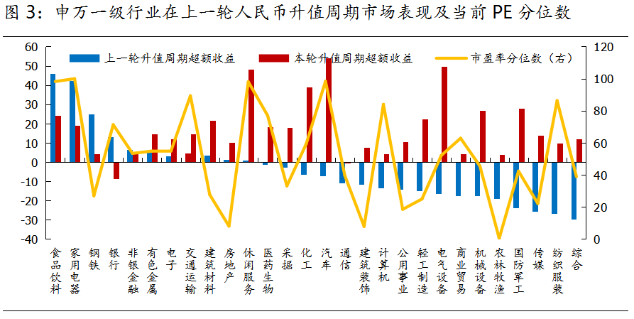 从投资逻辑来看,两类行业直接受益人民币升值。 一是航空等“美元负债”行业。 航空公司经营中持有大量的美元负债,因此人民币升值将为各航司带来汇兑收益,从而改善航空公司业绩。 二是造纸和石化等与进口成本挂钩的制造业。 人民币升值有利于降低进口成本,而造纸、石化等制造业对于纸浆、原油等原材料进口依赖度较高,有望显著受益。 历史经验而言,人民币升值阶段受益于经济复苏的板块占优。 人民币升值伴随中国经济基本面改善,在升值阶段与经济复苏密切相关的行业有望占优。人民币在2017年初至2018年2月经历了一轮升值周期, 期间食品饮料、家电、钢铁、大金融等受益于经济复苏的行业表现最佳,且这些行业在本轮升值周期中的超额收益还不及上一轮,因此后续或有一定机会。 人民币升值会增强A股表现。 人民币升值将提高人民币计价资产的价值,进而提高人民币资产的回报率,有利于吸引海外增量资金流入A股,从而增强A股表现。