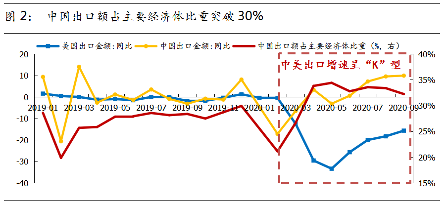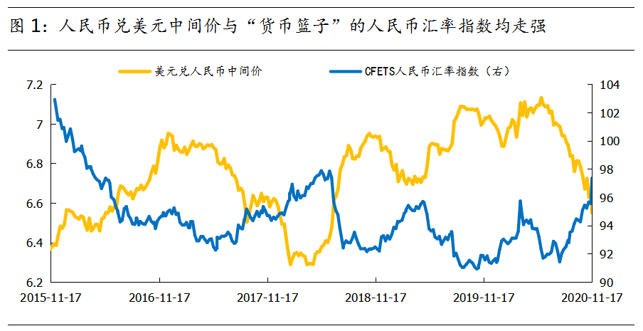 中国经济基本面是人民币汇率的“根基”。 5月以来,中外疫情“错位”,中国经济实现“V”型反弹。中国前三季度GDP同比增0.7%,是主要经济中的唯一正增长。贸易方面,中国出口额占主要经济体比重自5月以来维持在30%以上,是历史最高区间。中国经济、贸易的“扎实”基本面为人民币升值提供了良好支撑。 国内货币政策保持“克制”和“拜登交易”形成助力。 央行在上半年实行降准等宽松政策后,目前货币政策出现一定边际收紧,中美十年期国债利差走阔至十年来高位2.3%左右,人民币汇率升值动力增加。而拜登当选下一届美国总统,为市场注入了中美关系改善的预期,同时也强化了人民币的升值预期。