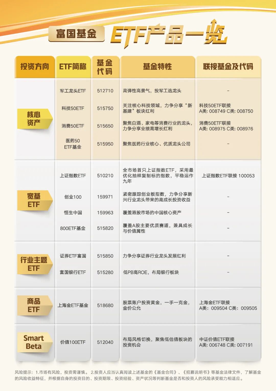 而凭借在指数领域深耕多年的优势,富国基金在ETF产品线上也展开了布局,目前已拥有科技50、消费50、医药50、军工龙头等核心资产ETF,证券ETF富国、富国银行ETF等行业主题ETF,上证指数ETF、创业100、800ETF基金等宽基ETF,以及上海金ETF基金等。
