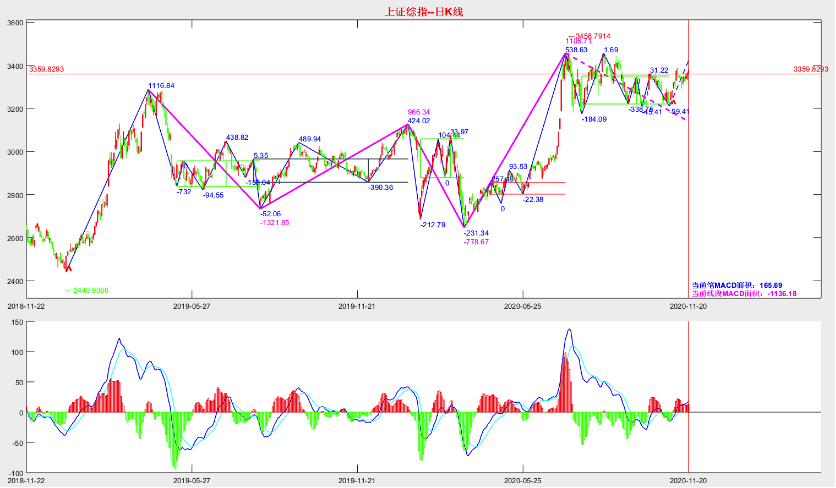 ➤ 其次,势渐起。从缠论的日线笔划分以及笔的力度格局来看,自9月中下旬以来,出现了三次底部反弹形成的向上笔,而每个向上笔所对应的MACD红柱子面积在逐步变大,这个意味着虽然前期经历了两次比较失败的反弹,但是当下的反弹力度在逐步加强,也就是势渐起。