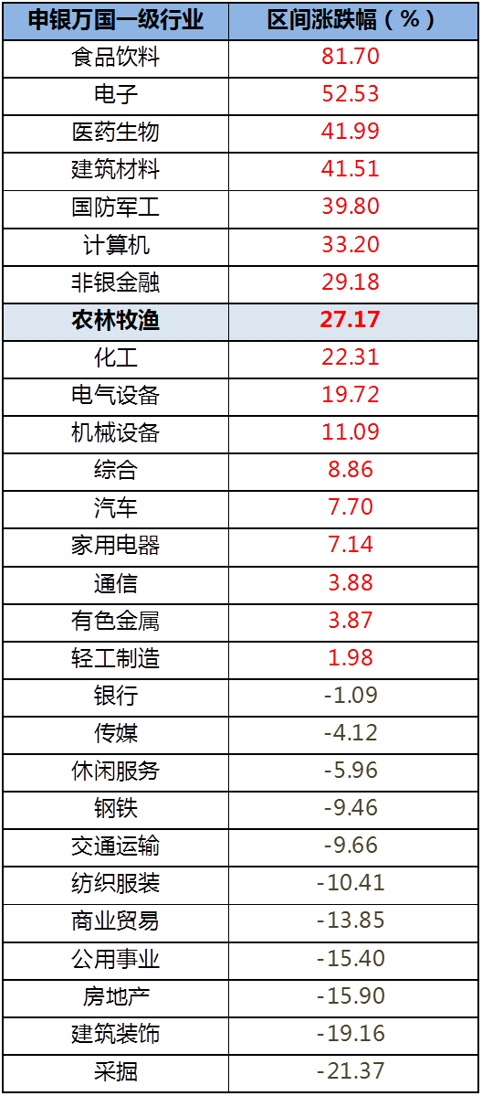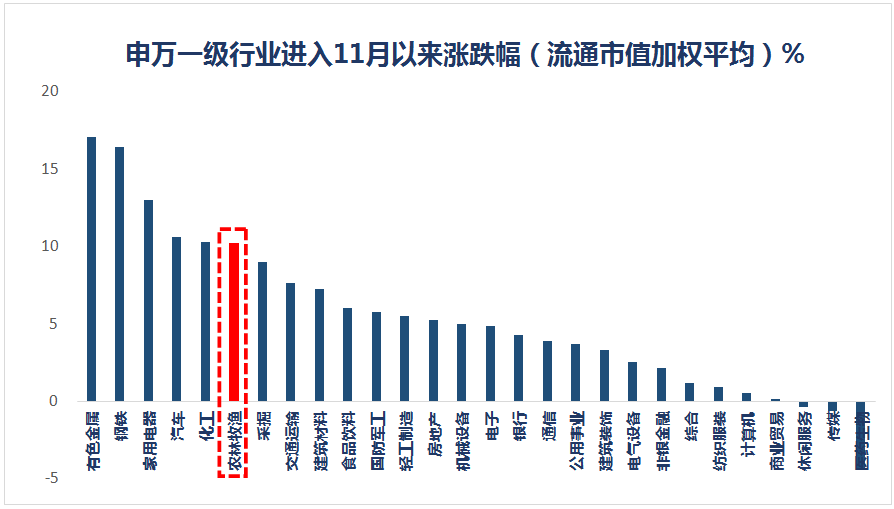 实际上,进入11月以来,申万一级行业中的农林牧渔板块开始攀升,截至上周五11月20日收盘,农林牧渔与有色金属、钢铁、家用电器、汽车等热门周期板块一同位列行业涨跌幅前列。