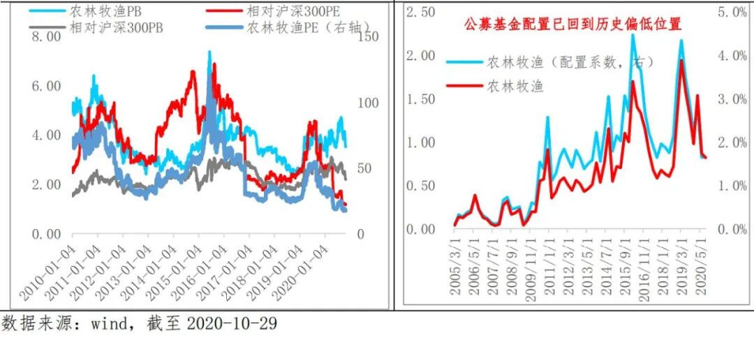 当前农林牧渔PB3.55倍已低于2010年以来中枢3.78倍,相对沪深300指数PB为2.21倍,历史中枢2.26倍。公募基金配置也从历史高位回归至2020年三季度的1.6%,远低于2016年一季度和2019年一季度的高点 3.4%、3.9%。