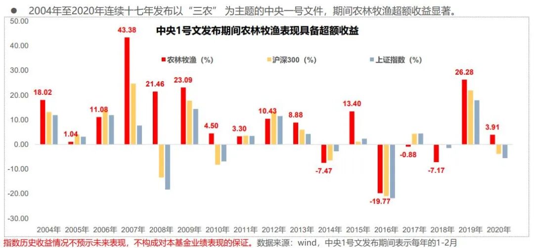 更何况根据Wind数据,在过去十几年里面,农业股在中央一号文件发布的1-2月有一定的超额收益。