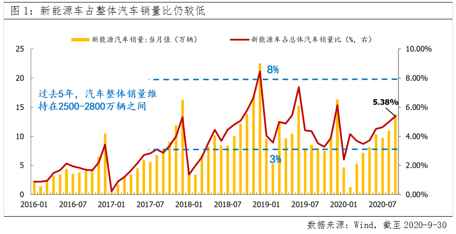 2018年以来,我国新能源车占汽车总销量比以5%为中枢波动,根据《规划》提出2025年新能源车占汽车总销量20%的目标,假设2025年汽车总销量为过去5年的高值2800万辆,新能源车仅依靠渗透率提升4倍,2025年销量将增长至为560万辆,年化复合增速超34%,显示出新能源车成长空间大,增速快的行业特征。