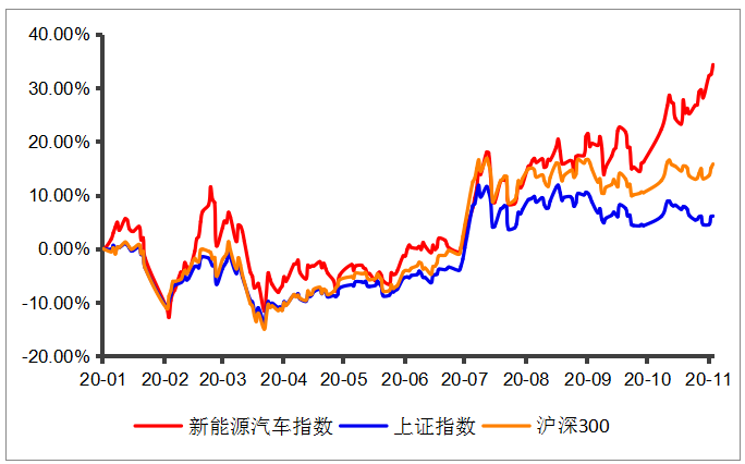 2019年,我国新能源汽车销量从2010年的0.49万辆显著增长到了120.6万辆,占所有汽车销量比例仅为4.68%。如果汽车年销售总量是2500万辆,20%则是500万辆。无疑,这个数量将非常巨大。 今年以来,新能源汽车产业链备受市场追捧,Wind数据显示,截至11月3日,今年以来新能源汽车指数涨幅达到34.96%。 数据来源:wind,统计区间:2020年1月1日至2020年11月3日 随着新能源车销量提高了,上下游产业链自然也是活力满满,新能源车行业投资价值再次被关注。 其中,那些善于长期蛰伏观察的投资猎手,能通过持续深度的研究、中长期视角的布局,来顺利捕获新能源产业链长期成长的投资机会。