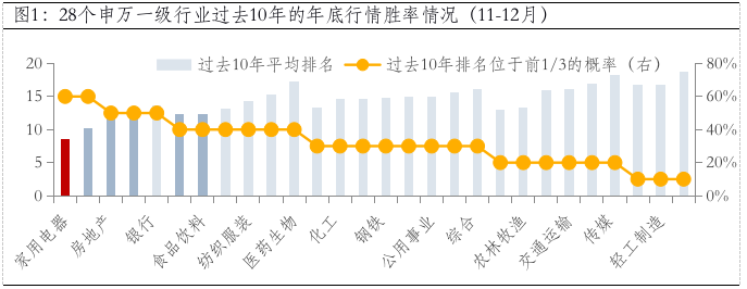 统计过去十年11-12月份的行业表现可以看出,家用电器的平均排名在28个申万一级行业中位居首位;此外,家用电器的排名位于行业前1/3的概率达到60%,同样位列第一,“日历效应”尤为显著。