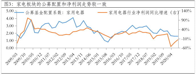 从历史看,家电板块的公募配置变动和净利润走势较为一致,在家电行业景气周期向上时,公募基金会加大对家电板块的配置。