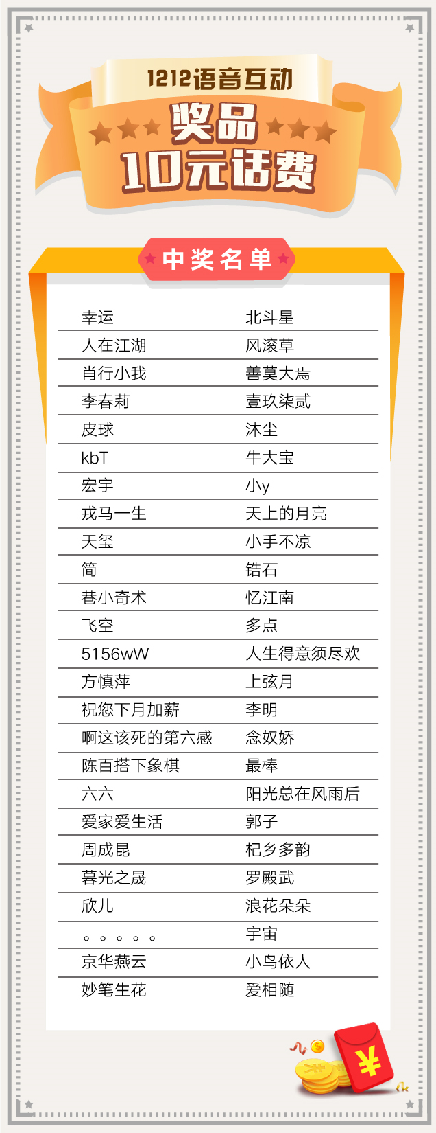 话费将于12月18日(本周五之前)充值到中奖客官后台预留的手机号码中,请各位客官耐心等待~