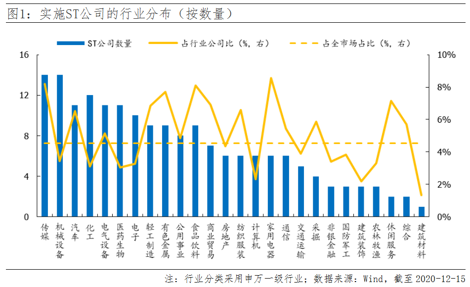 那么,既然退市新规对ST公司负面影响最大,哪些行业的ST比例较高呢?按数量来看,家电、传媒、食品饮料的比例较高,在8%-9%;按市值看,机械设备、化工、商业贸易的比例较高,均在2%左右。但其实整体占比并不算高,所以对行业的冲击或较小。