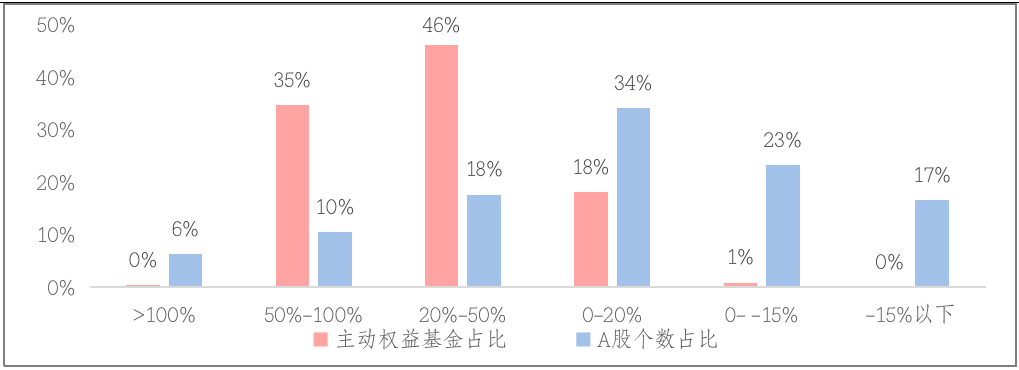 投资胜率优势明显。从收益率分布看,全年收益在50%以上的基金个数占比为35%,同期,A股个数占比仅为16%;收益区间在20%-50%区间基金个数占比为46%,而A股仅为18%;投资收益大于0的基金个数占比高达99%,而A股仅为60%。