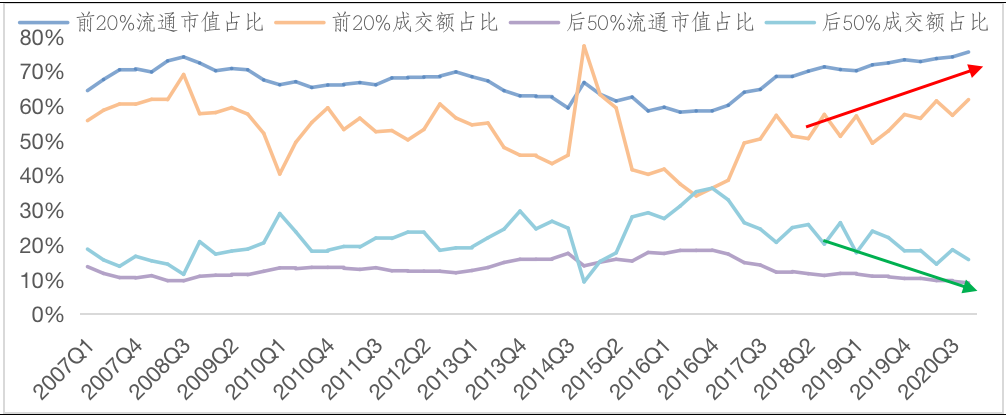 按自由流通市值口径排序,前20%的公司的合计市值占比,从2016Q4的58.60%上升至当前的75.54%,合计交易额占比从2016年Q4的36.33%,抬升至目前的61.83%。与此对应的是,流通市值排名后50%的公司,合计市值占比从2016年Q4的接近20%回落到目前的不到10%,交易额占比则从36.33%回落到15.75%。这样的市值结构和交易结构变化,使得结构性行情愈加深化,机构投资优势开始显现。