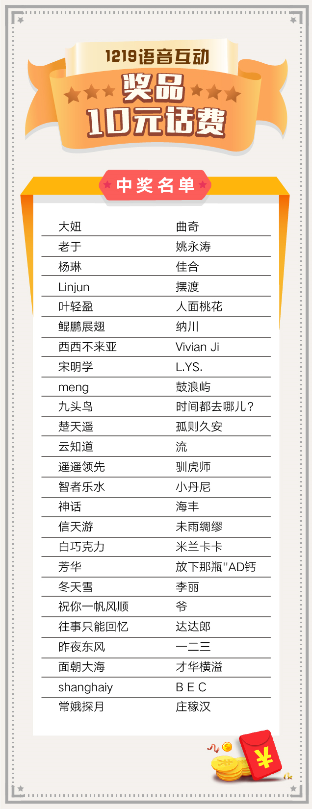 话费将于12月25日(本周五之前)充值到中奖客官后台预留的手机号码中,请各位客官耐心等待~