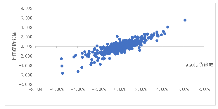 从相关性上看,2018年以来,A50期货指数涨跌与上证综指涨跌的相关系数高达86%,相关性非常高。